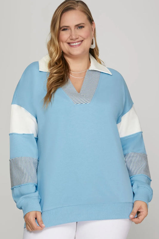 She + Sky Full Size Color Block Sleeve Johnny Collar French Terry Sweatshirt Plus Size