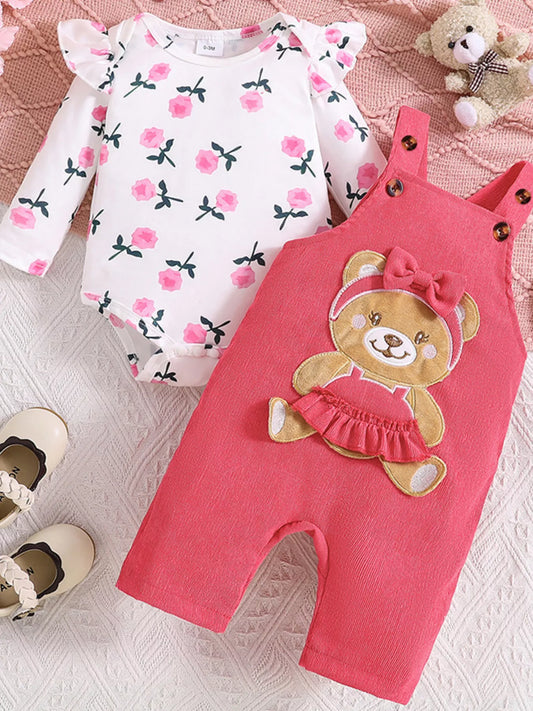 Children's Floral Print Ruffle Trim Bodysuit & Bear Applique Overalls Set