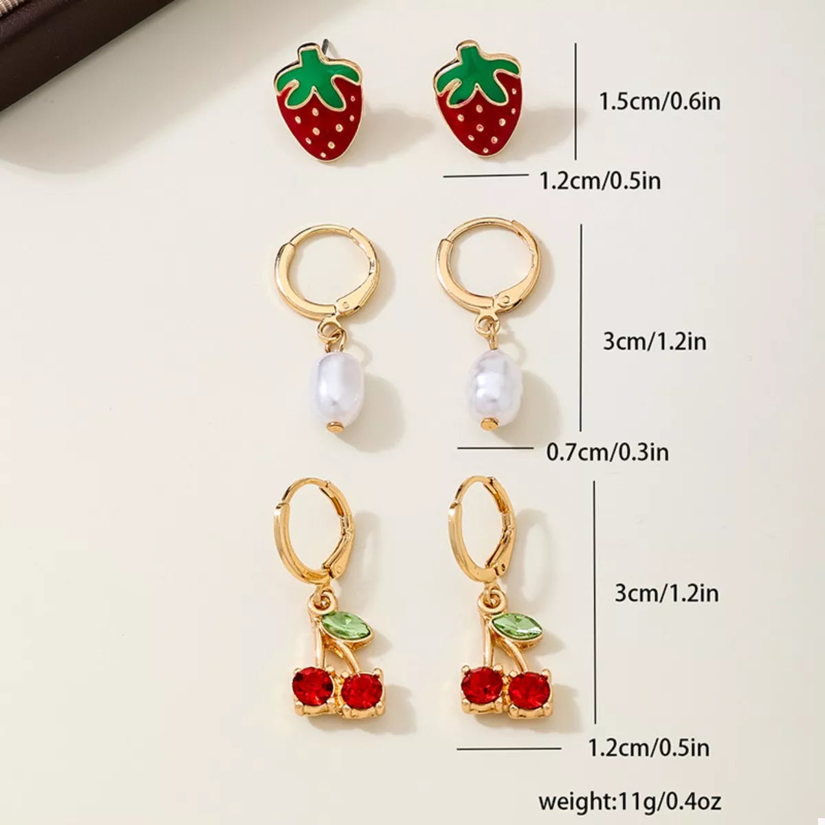 3 Piece 18K Gold-Plated Strawberry Cherry and Pearl Earrings