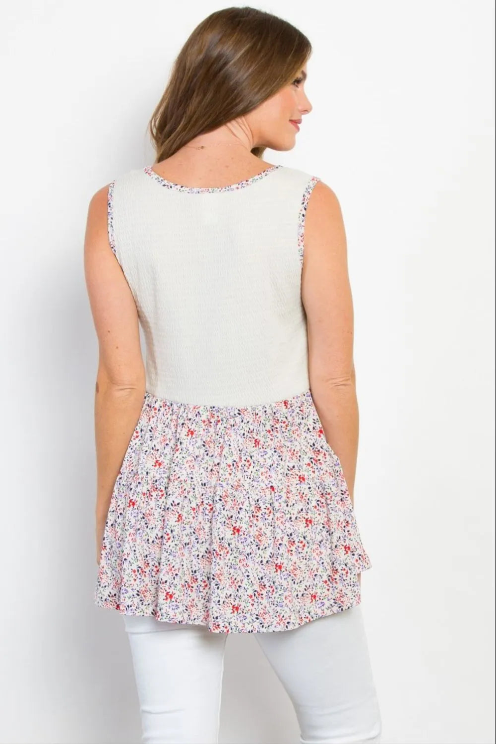 The Smocked Printed Peplum Sleeveless Top is a trendy and feminine piece that features a flattering peplum silhouette and stylish smocked detailing. The printed design adds a pop of color and personality to the top, making it a fun and eye-catching choice for various occasions. With its sleeveless construction, this top is perfect for warm weather and can be easily layered for cooler days. The smocked bodice provides a comfortable and figure-enhancing fit, while the peplum hem adds a flirty touch to the overall look. Whether you're dressing up for a night out or keeping it casual for a daytime event, this top is a versatile and fashionable option. Elevate your wardrobe with the charming style of the Smocked Printed Peplum Sleeveless Top and showcase your playful and chic sense of fashion.