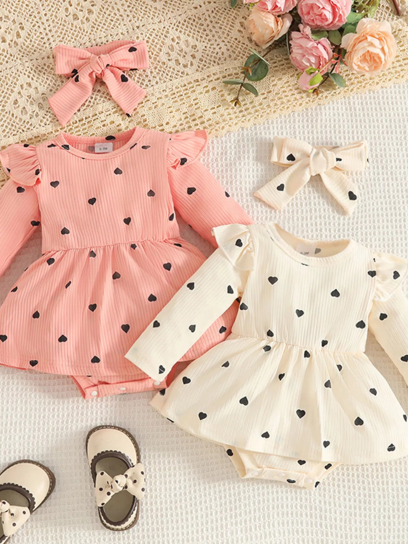 Children's Heart Print Ruffle Trim Bodysuit Dress with Headband