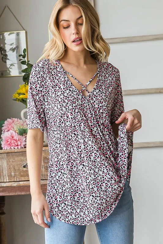 A short sleeve crisscross animal babydoll top is a trendy and playful piece that combines style and comfort. The crisscross detailing adds a stylish touch to the neckline, while the animal print pattern brings a fun and edgy element to the top. The babydoll silhouette is loose and flowy, making it flattering and easy to wear. Pair this top with jeans or shorts for a casual and trendy look perfect for everyday wear.