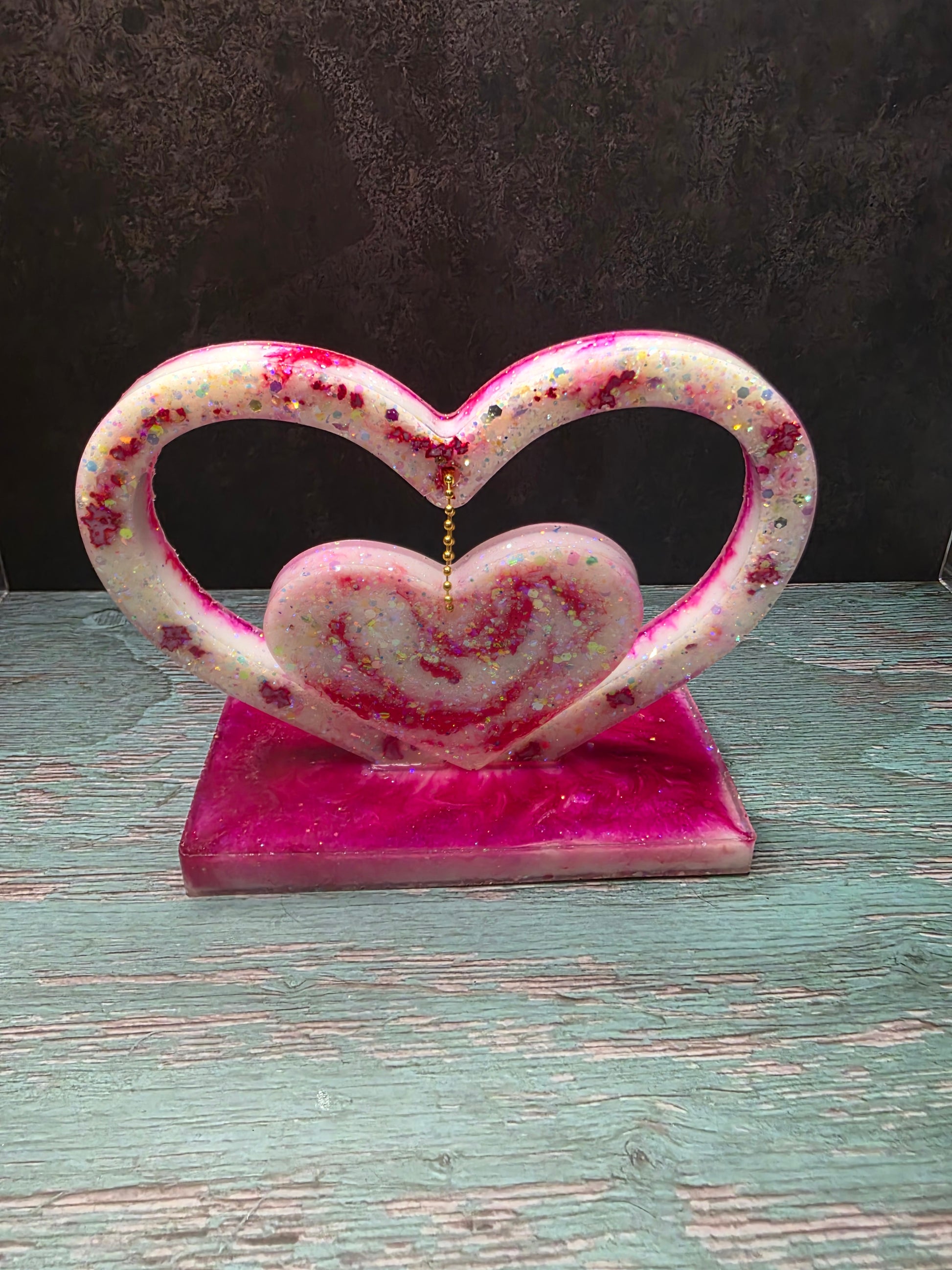 We present Resin Hearts - a customizable way to add unique touches to your decor. Made from high-quality resin, these hearts are perfect for elevating any space. With endless possibilities for customization and flipping them around to change it up, one style one on side and another when you turn it, let your creativity run wild and make a statement with Resin Hearts. We may also had a photo into the dangling heart.