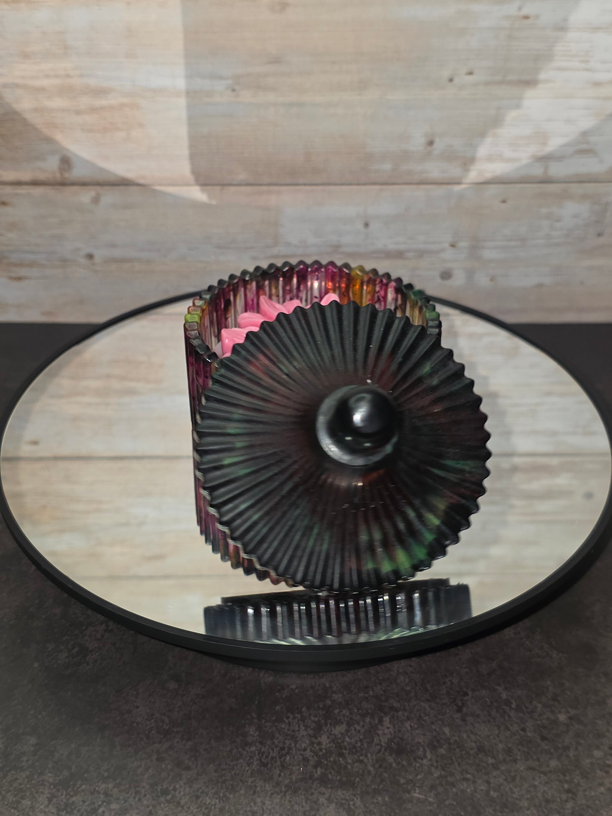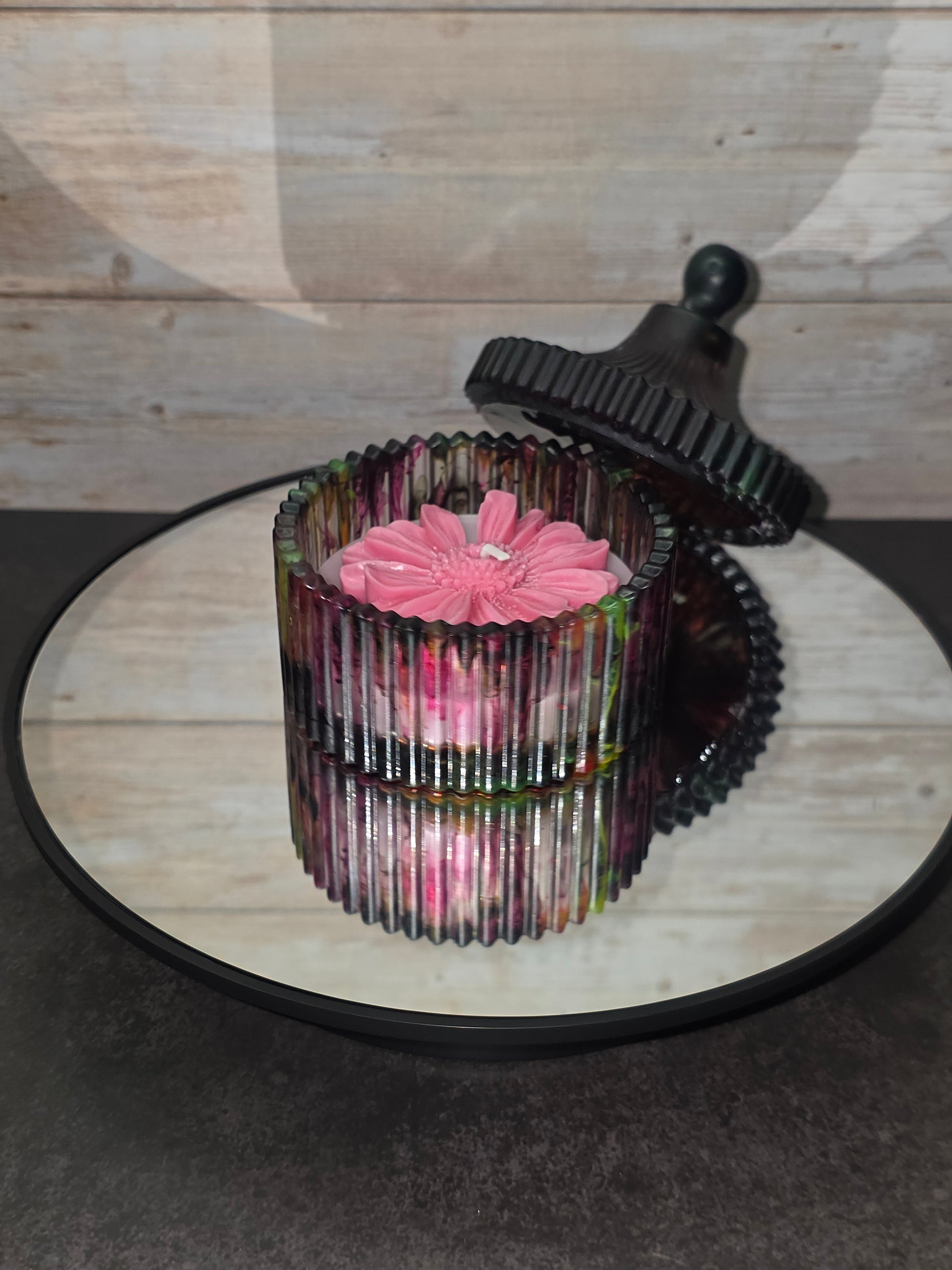 "Experience the sweet aroma of our Resin Striped Candle Jar. With a mystery scent and topped with a cute flower, this candle will bring warmth and relaxation to any space. Made with high-quality resin, it's the perfect addition to your home decor."